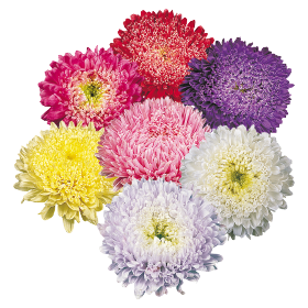 An F1 hybrid dwarf China Aster mix featuring large, double, slightly curled blooms in a wide range of vibrant colors (red, white, pink, blue, purple, yellow). This variety is compact, typically growing to a height of 8–10 inches (20–25 cm), making it ideal for bedding plants, borders, and patio containers.