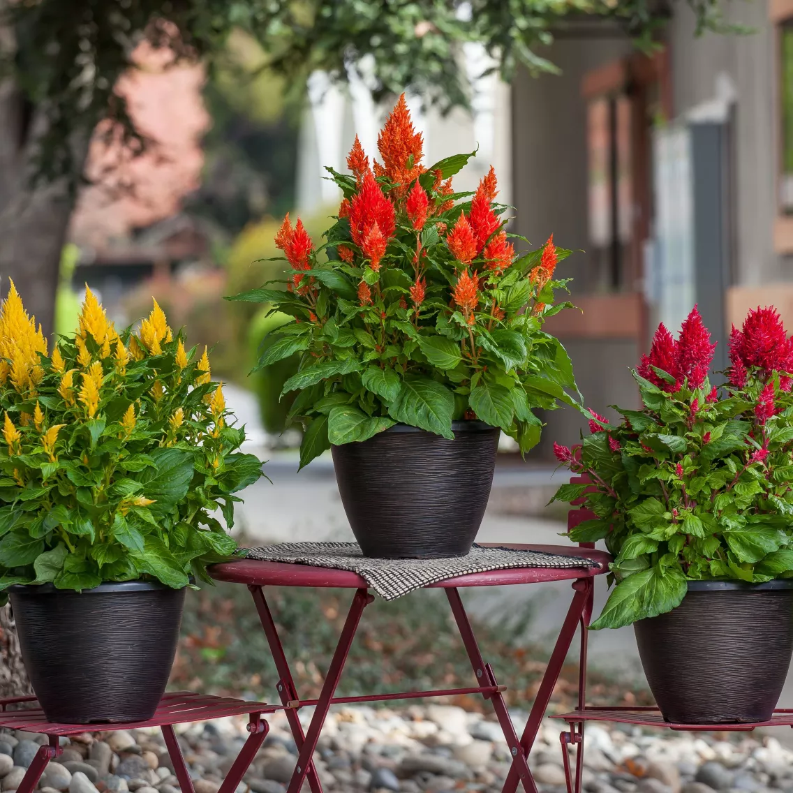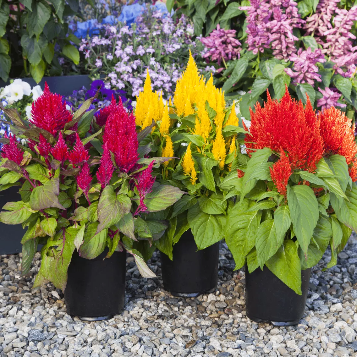 A semi-tall F1 hybrid plume Celosia mix (Celosia plumosa) that produces bright, uniform, flame-shaped plumes in a wide array of vibrant colors (red, orange, yellow, pink, white). This vigorous variety is heat-tolerant, reaches approximately 24 inches (60 cm) in height, and is excellent for landscape borders, mass plantings, and cut flower use.