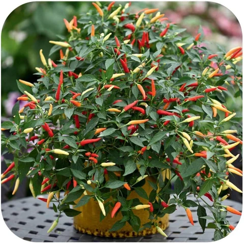 The name comes from the sheer volume of small, hot peppers produced—often hundreds on a single plant—which ripen in a fiery spectrum of colors including cream, purple, orange, and vibrant red. Unlike some purely ornamental types, the ‘Basket of Fire’ peppers are edible and quite hot (rated around 80,000 SHU).